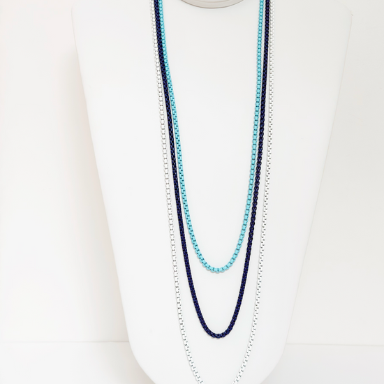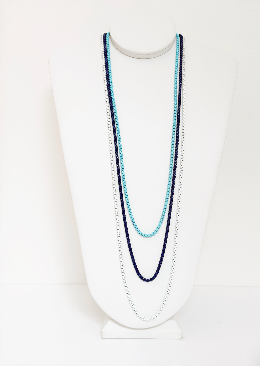Long three-layer white, light, and navy blue necklace